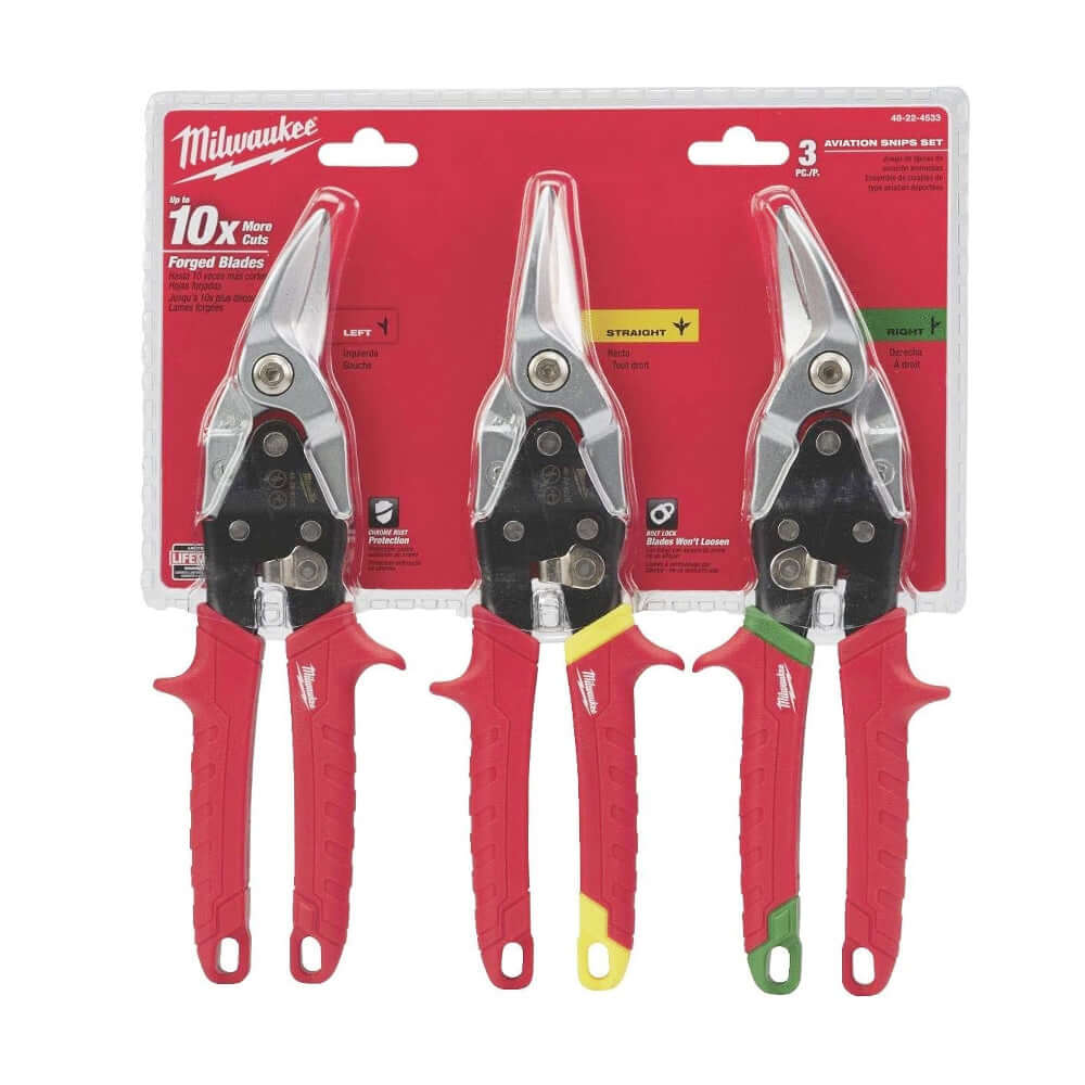 The Milwaukee 3 Piece Tin Snips Set (model 48224533) is a set of aviation snips that are designed for long life and durability. The forged steel blades are said to make up to 10 times more cuts than cast blades, and the chrome plated bolt lock ensures the blades won't loosen. While in use, these aviation snips won't hang up on any material as they are designed with a flush pivot bolt for easy cutting. The metal lock can be easily used with one hand and it will secure the blades for easy transportation. includes 1x left cut, 1x right cut and 1x straight cut snips, making it a versatile tool for a variety of cutting tasks.